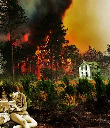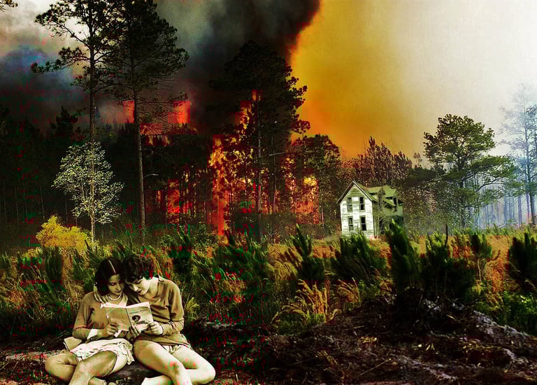 Pre-AI hybrid work layering photographs, paintings, and found imagery into impossible spaces. Theatrical staging, surreal narratives, hybridity as method. 2010-2014.