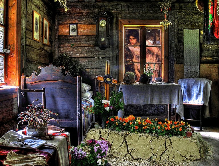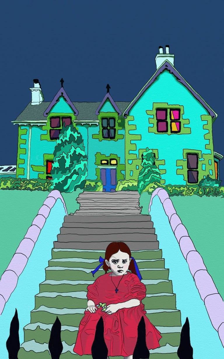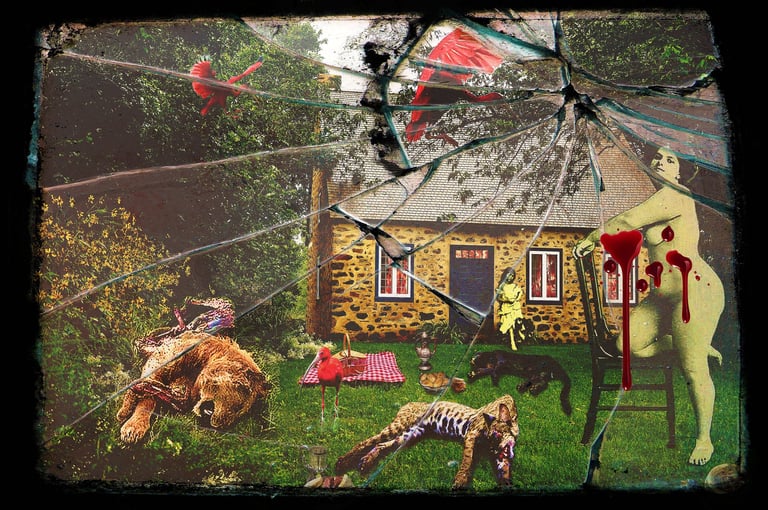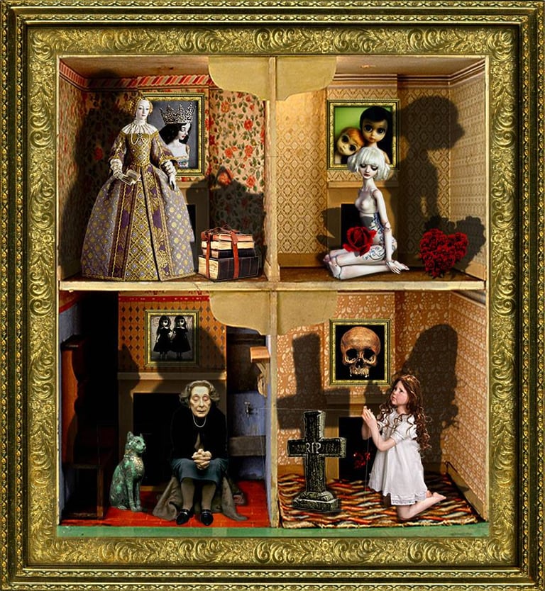 Certain themes repeat. Death. Transformation. A sense of vulnerability, especially around the feminine figure. People dressed in historical clothing face moments of threat or decay. Dollhouses become reminders of loss, with skulls, empty rooms, and tiny objects acting like memento mori. Domestic spaces—bedrooms, kitchens, living rooms—never feel sealed or safe. Something always breaks in from the outside, something that doesn’t belong. That tension between a protected interior and an invading exterior runs through everything.