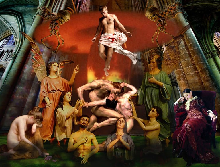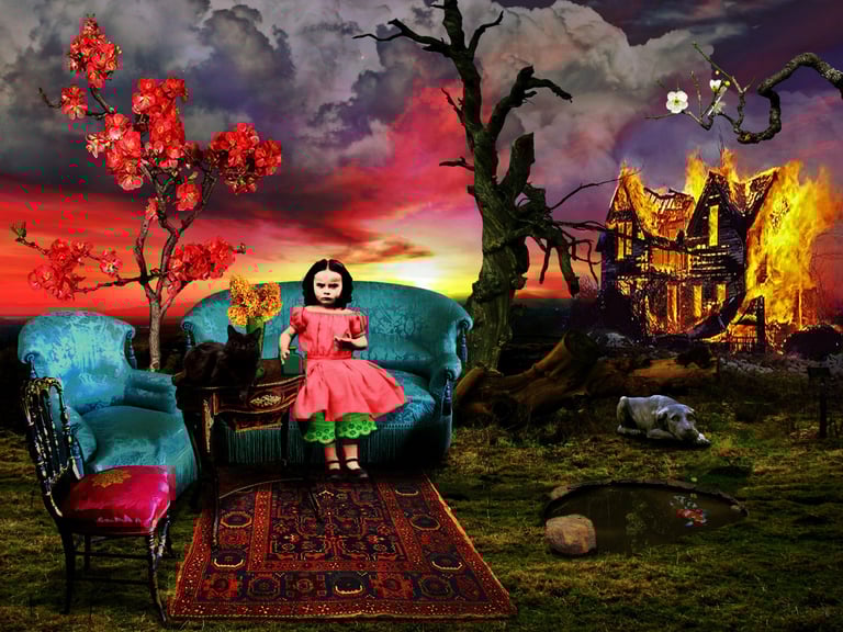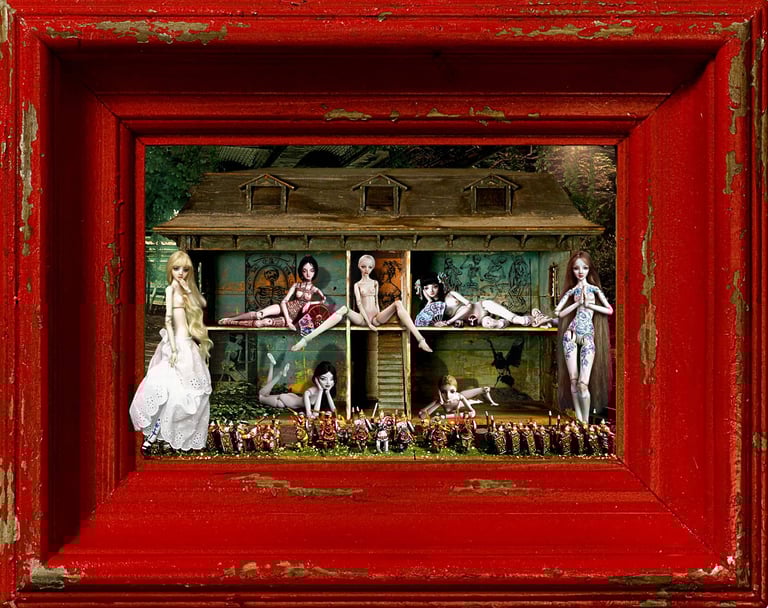 I came to understand hybridity not as a kind of contamination but as a way of thinking. A burning house can sit comfortably next to a piece of Victorian furniture. A classical nude can share the frame with a sea creature. Dolls can live inside tiny stages inside larger stages, each one revealing that any representation—no matter how realistic—is still a kind of theatre. These works never pretend to be documentary truth. They announce themselves as constructed. Because of that, they’re able to say things a straightforward, realistic image often can’t.